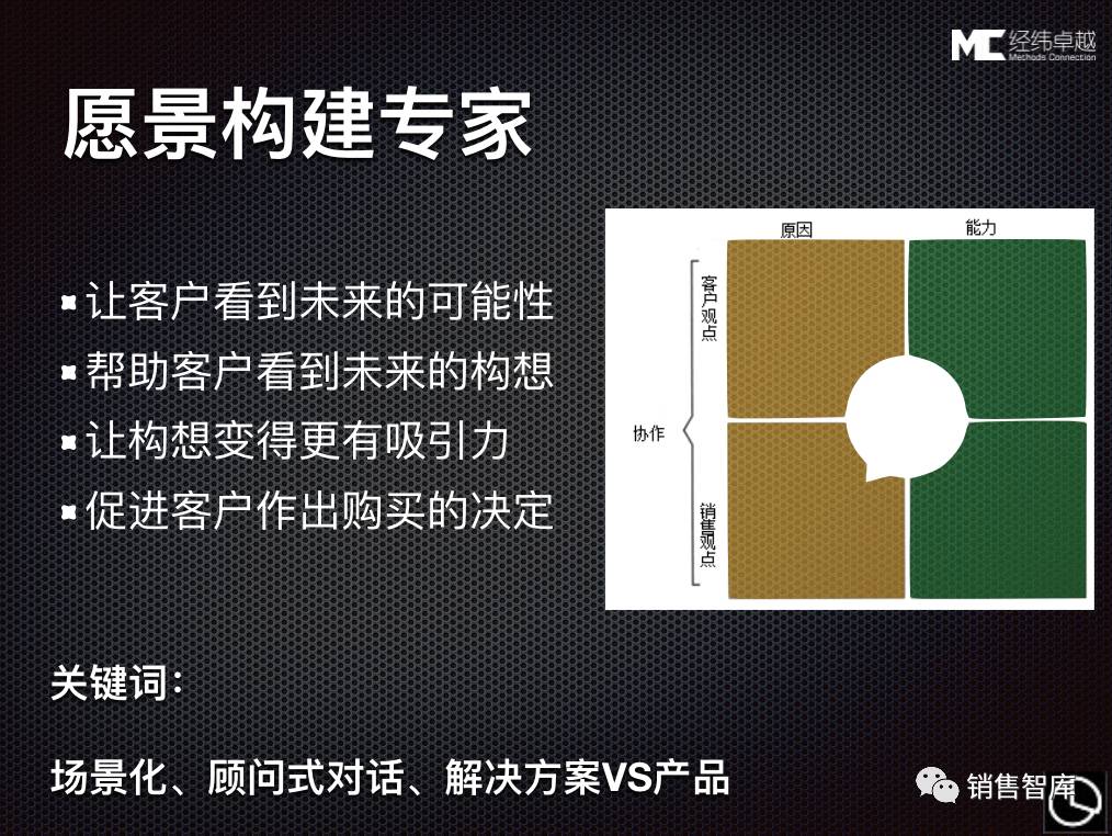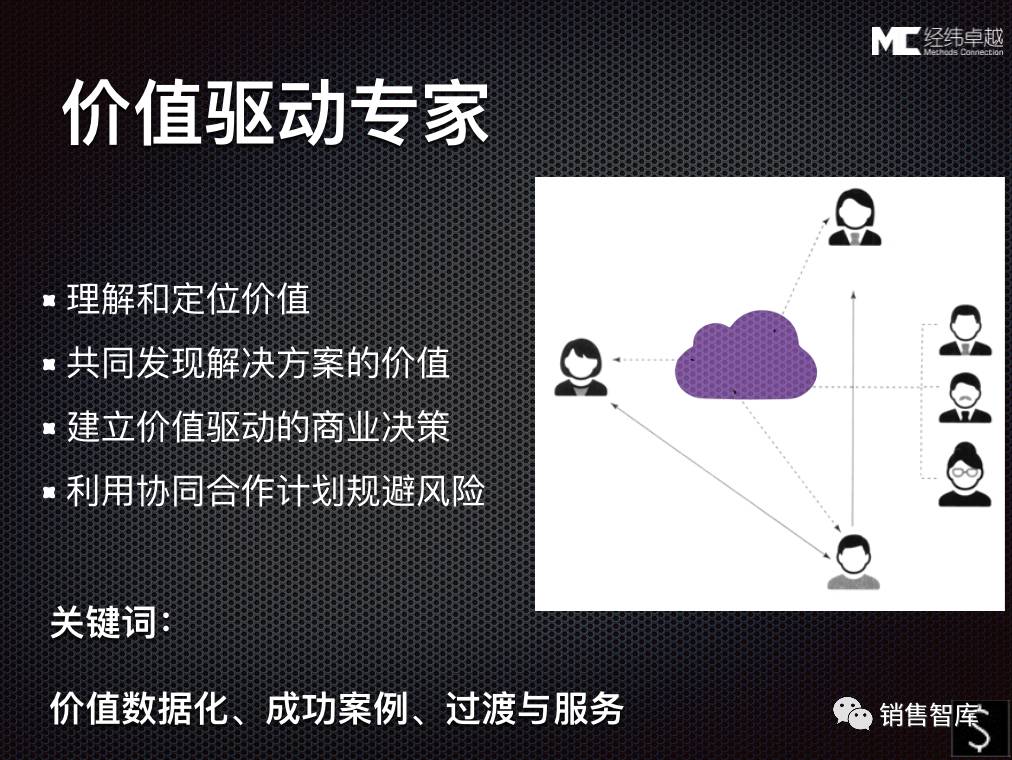 (3)风险管理专家——善于对越来越复杂的购买流程和买方决策架构巧妙定位并展现价值。